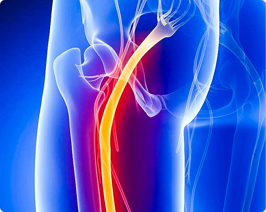 Hip joint disease often causes deep aching in the groin or front thigh, worse with walking or stairs. Lumbar nerve compression tends to cause burning or tingling down the leg. Diagnostic injections into the hip or spine can confirm the true source.