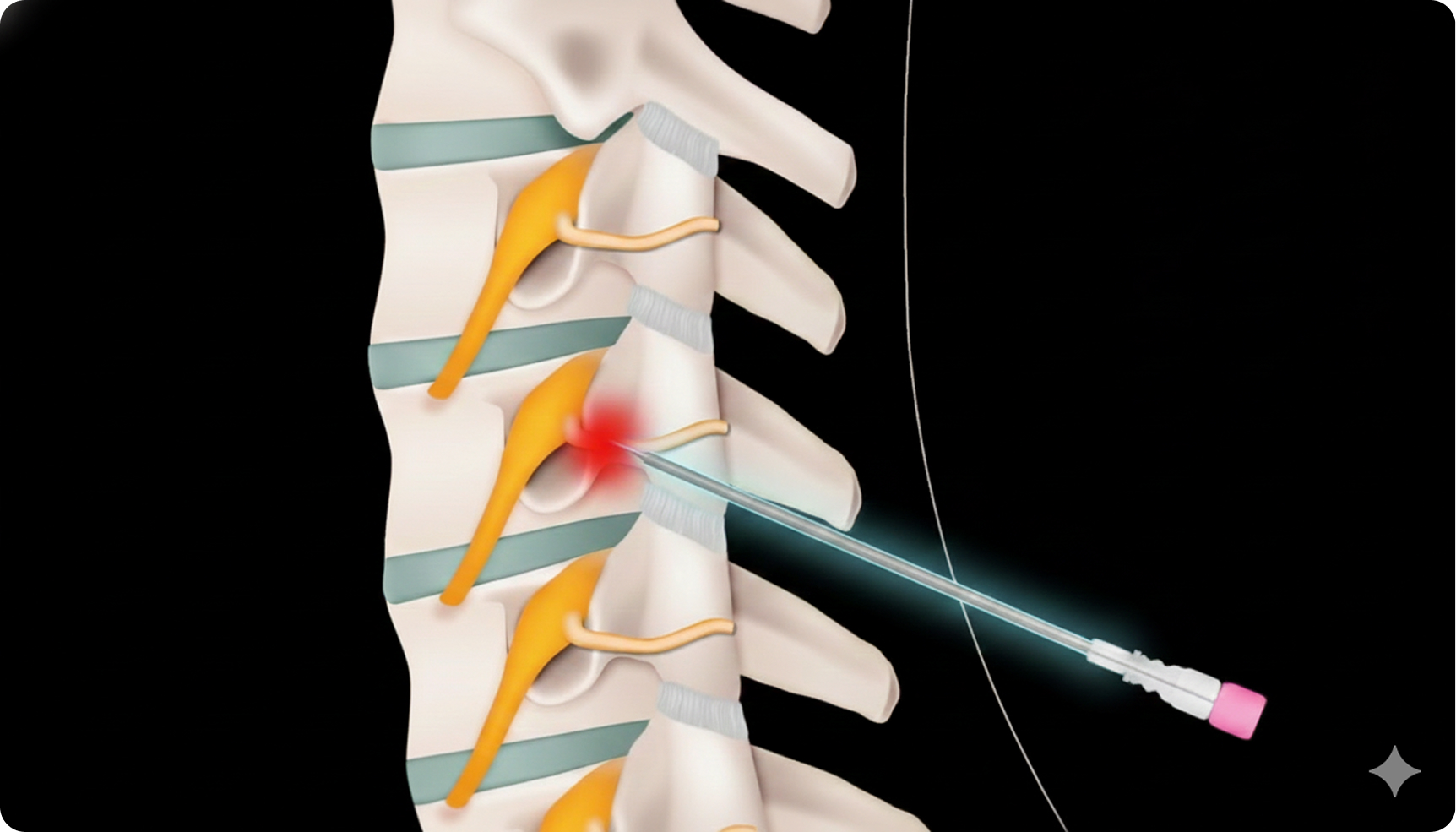 A medial branch block temporarily numbs a spinal joint to confirm the pain generator. If it works, radiofrequency ablation (RFA) uses heat to deactivate that small nerve for 6–12 months. The joint stays stable, and pain often lessens dramatically.